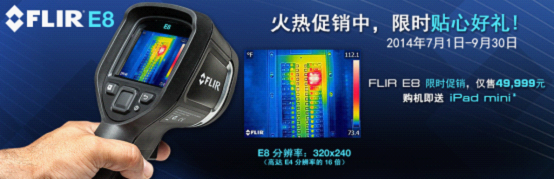 中国电力电工网讯:享誉世界的红外热像仪专家FLIR宣布,从即日起至2014年9月30日,旗下Ex系列红外热像仪重磅产品FLIR E8将限时促销,促销期间,FLIR E8除将产品单价优惠至49,999元以外,购机用户还将获得由指定经销商提供的贴心好礼——Apple iPad mini一台或等值其他礼品。