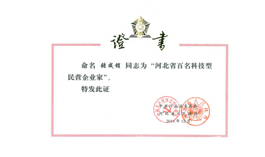 张成锁董事长荣获“河北省百名科技型民营企业家”荣誉称号