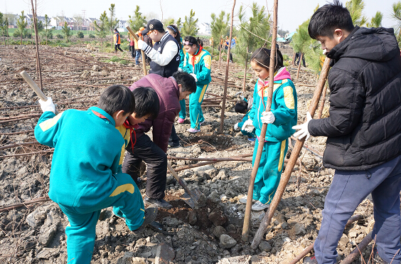 为了提高大家植树的积极性,同时考虑到安全等问题,现场分成了8组,由一个大人带领三个孩子组成一个植树小分队。大家各司其职,挖坑、夯土忙得不亦乐乎。孩子们的热情丝毫不亚于大人们。这幅热闹且充满干劲的画面吸引了当地电视台记者的瞩目。电视台记者随机采访了金安小学学生代表汤云刚及我司员工代表沈炯。看着孩子自信满满的面对镜头回答记者的提问,让现场的大人们都刮目相看。特别是当记者问道,“今天为什么要植树呢?”他回答道,“今天是植树节,我们和LS产电的大哥哥大姐姐一起来植树。我希望植树能让天空更蓝,让我们远离雾霾。”