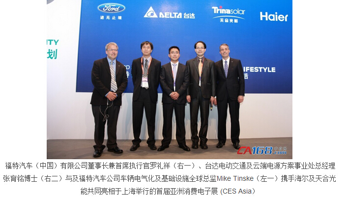 5月25日-27日,台达与福特汽车、海尔、天合光能携手亮相于上海举行的首届亚洲消费电子展 (CES Asia),共同宣布将四方联合打造的“福特智?能生活”项目引入中国市场,为降低中国家庭的能源消耗及支出提供整体解决方案。作为全球电源管理与散热解决方案领导厂商,台达在“福特智?能生活”项目中提供智能型的电动车充电解决方案,并在福特展台实地展示台达壁挂式高效充电器产品,让到场观众更直观地体验台达电动车充电解决方案的性能、安全性、便捷性和智能性。