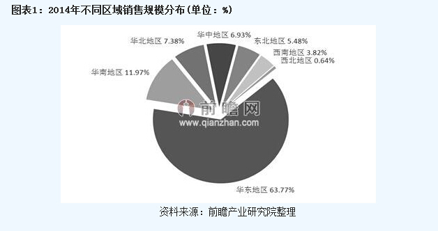 据前瞻产业研究院发布的《2015-2020年中国电线电缆行业市场需求预测与投资战略规划分析报告》数据显示,2014年,华东地区电线电缆行业销售规模最大,占全行业销售收入的一半以上,达到63.77%,其次是华南地区,销售收入占全行业销售收入的11.97%。其他地区电线电缆行业销售收入均在10%以下。