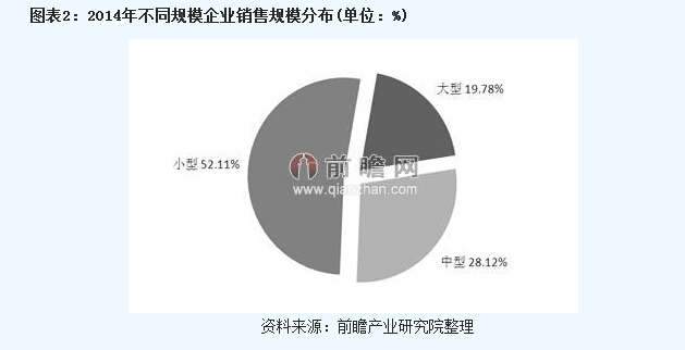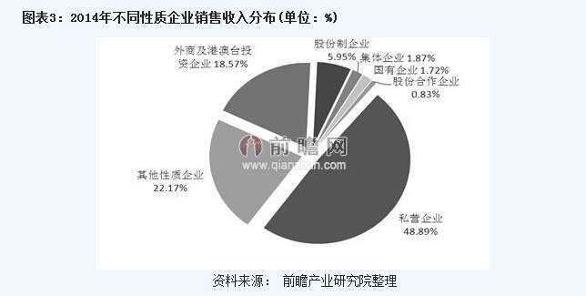 2014年,私营企业的销售收入占全行业销售收入的将近一半,达到48.89%,其次是其他性质企业,销售收入占比22.17%,外商及港澳台投资企业的销售收入占比18.57%,股份制企业的销售收入占比5.95%,而国有企业的销售收入仅占全行业总收入的1.72%。