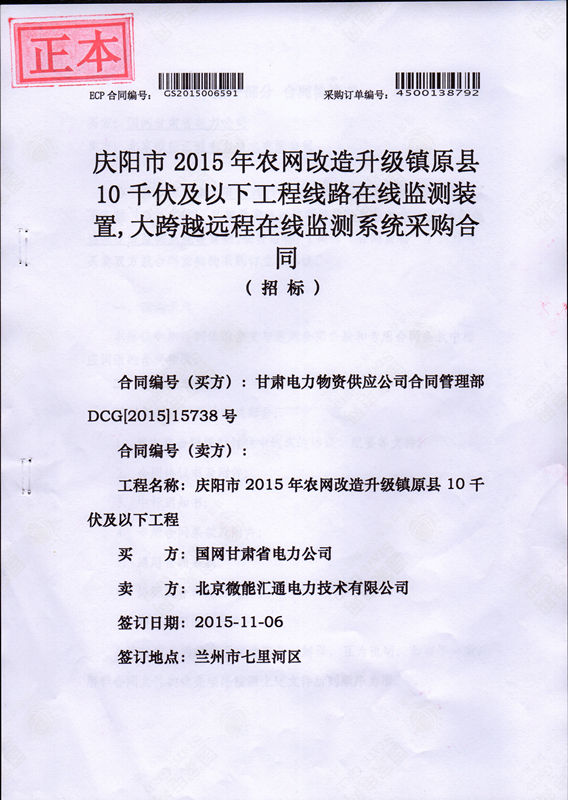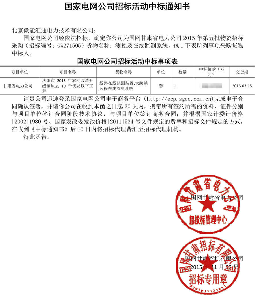 热烈庆祝北京微能汇通电力技术有限公司成功中标国家电网公司庆阳市2015 年农网改造升级镇原县10 千伏及以下工程项目,(招标编号:GW271505)货物名称:测控及在线监测系统。