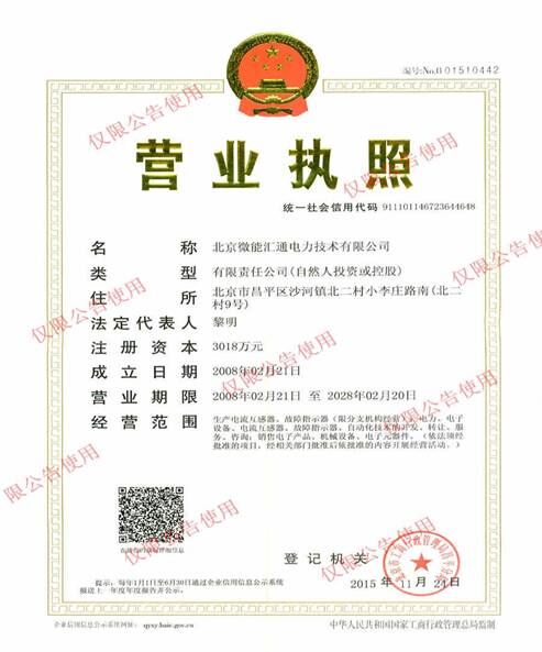 为扩大经营规模、拓宽业务、提高公司的资信度,北京微能汇通电力技术有限公司于2015年12月增加注册资金至3018万元,同时响应国家号召办理“三证合一”,之前工商行政管理部门核发工商营业执照、组织机构代码管理部门核发组织机构代码证、税务部门核发税务登记证,将统一合并到一个营业执照。