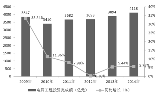 2013年,中国电网工程建设完成投资3894亿元,占电力工程投资比重为51.20%,同比提高1.6个百分点。2014年,中国电网工程建设完成投资4118亿元,同比增长5.75%。