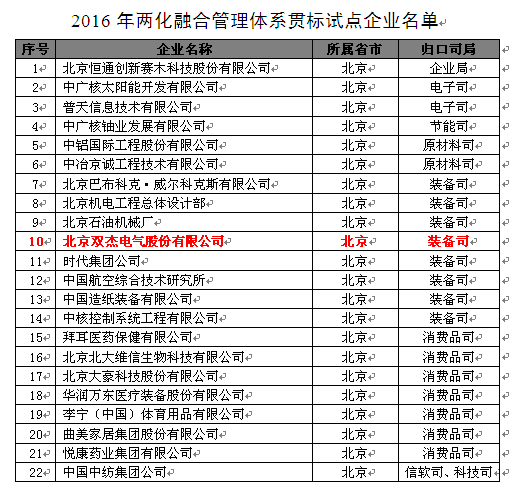 日前,工信部发布了《关于公布2016年两化融合管理体系贯标试点企业名单的通知》(工信厅信软函〔2016〕359号)。北京市共有22家企业评选为两化融合管理体系贯标试点企业(详见附表)。北京双杰电气股份有限公司(下文简称:双杰电气,股票代码:300444)作为民族电力设备制造企业榜上有名,顺利通过两化融合管理体系贯标试点企业评定,成为全国两化融合管理体系贯标试点评定企业之一。